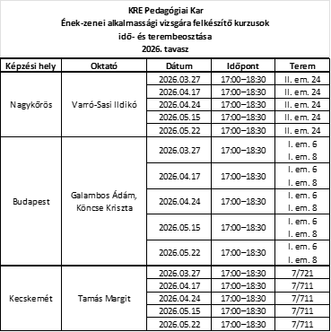 A Károli Gáspár Református Egyetem Pedagógiai Kara ének-zenei alkalmassági vizsgára felkészítő kurzust hirdet pedagógus szakra jelentkezők számára. Szeretnénk segítséget nyújtani azon jelentkezőinknek, akiknek sok esetben több évnyi kihagyás után kell újból énekelniük, és teljesíteniük az alkalmassági vizsgát. A csoportos foglalkozásokat – kellő számú jelentkező esetén – ének-zene szakos munkatársaink 90 perces időkeretben tartják, 5 alkalommal 17.00 órai kezdettel.